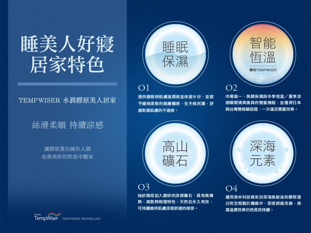 膠原蛋白與頂級奢華80支天絲的結合,每一秒的睡眠皆呵護著您細嫩的肌膚,睡眠兼具保養讓您越睡越美麗!