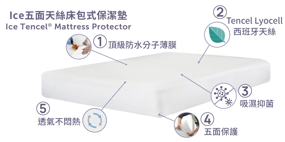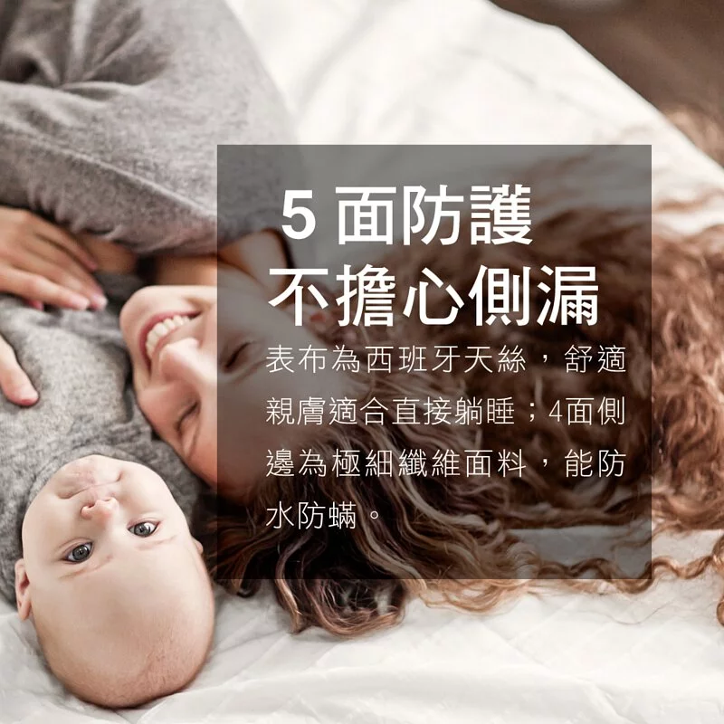 五面強力防護、不用擔心側漏!躺睡面採高級天絲面料,夏涼冬暖絕佳調溫性,舒適親膚可直接躺睡,適合與嬰兒同床的媽咪及敏感性肌膚使用,4面側邊為極細纖維面料,五面能防水防蟎超透氣,隔絕過敏原與肌膚接觸並防側邊受髒汙。