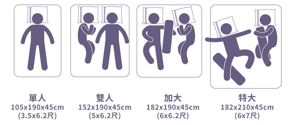 單人、雙人、加大、特大床包式保潔墊適用於厚度45公分內的床墊。