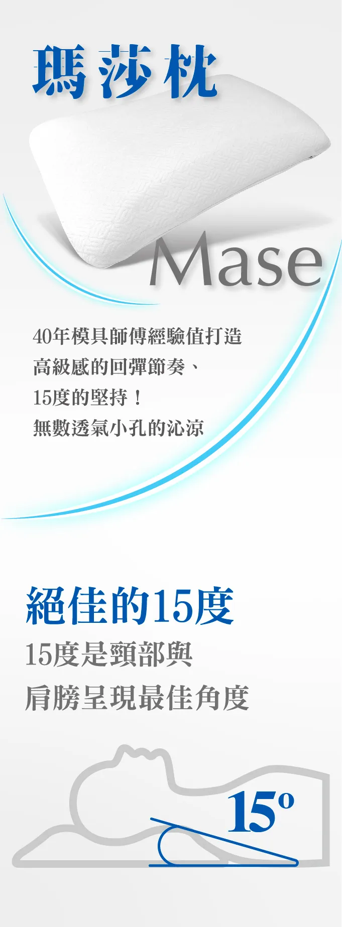 • 反覆調整與測試以貼近最適合人體睡眠所需要的肩頸角度