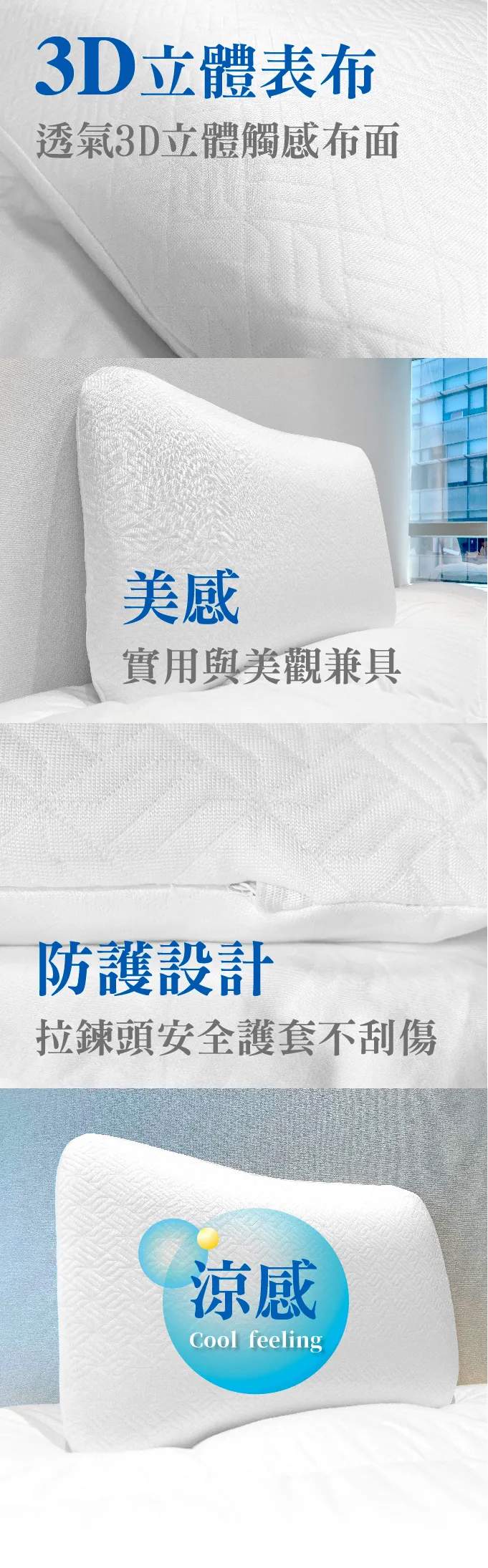 再加上涼感材質表布,頭靠下去後就可以感受透氣沁涼的加倍舒適.